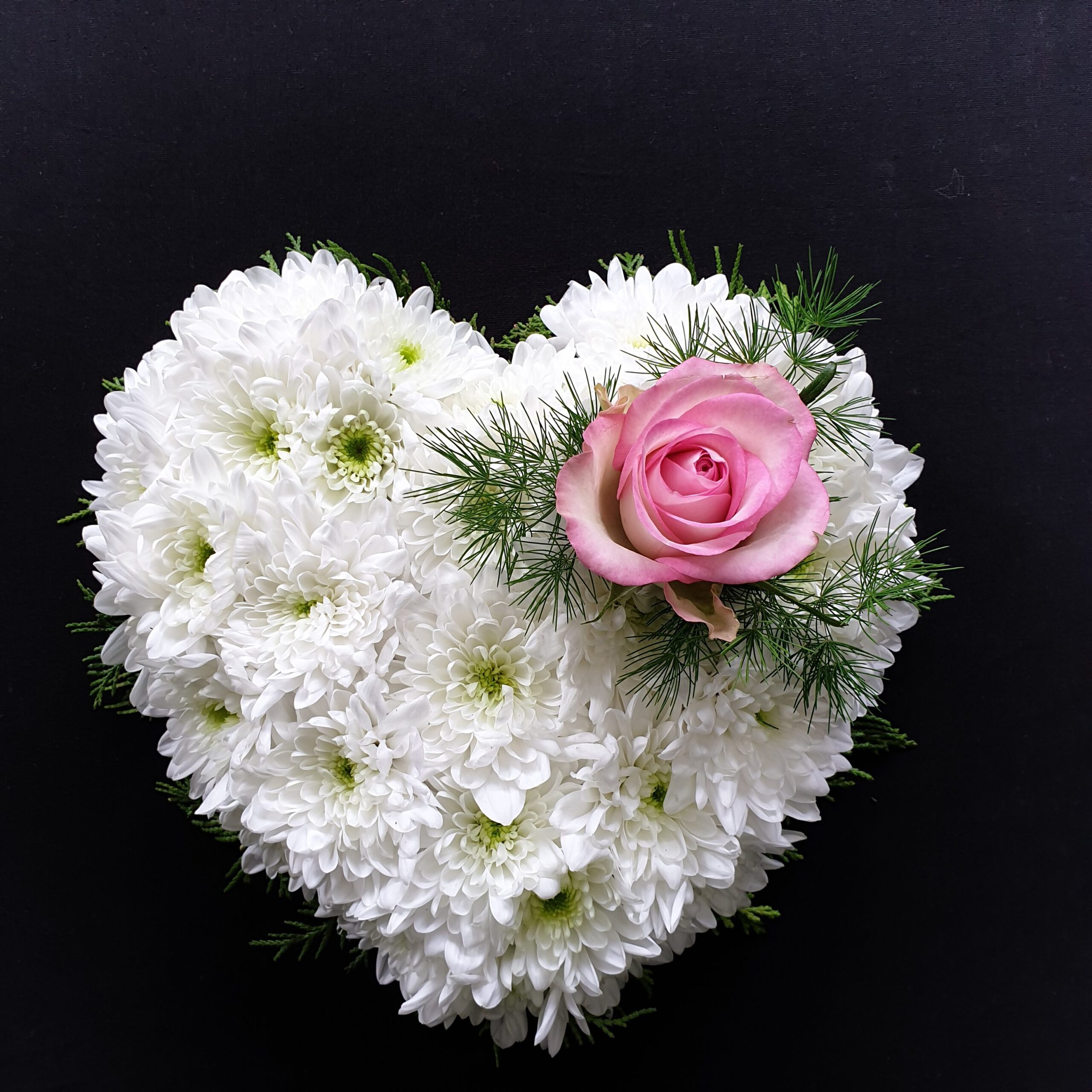 Our Miniature Pink Rose & White Chrysanthemum Heart is a beautifully gentle way to say goodbye. The heart is fully based in white chrysanthemums, creating a soft cushion of petals that symbolises purity, love and remembrance.